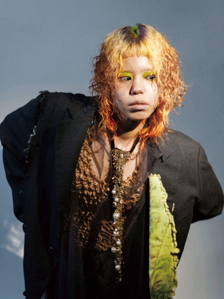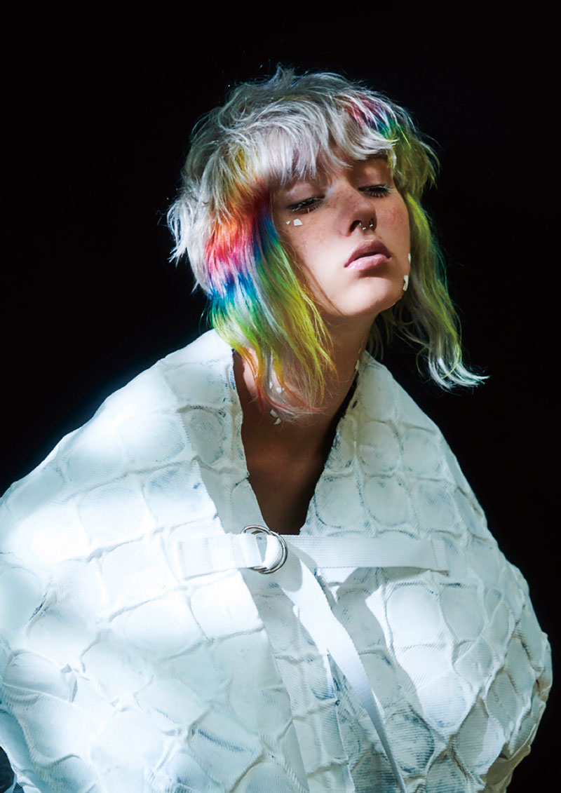 「こちらの作品は、3年前、はじめて作品撮りを行ったときのもの。ヘアスタイル全体のなかで一部にだけ大胆なカラーを集中させ、光の当たり方によって“光彩”を感じてもらえるようにデザインを構成しました。また、ほおやフェイスラインに卵の殻をアクセントでのせ、卵をイメージさせる衣装と一体感がでるようにしています。このとき、ウィッグを使用する撮影も初めてで戸惑うことも多かったのですが、すごく楽しかったんですよ。今も試行錯誤しながら作品づくりをしています。悩むこともありますが、やはり楽しさのほうが上回りますね」