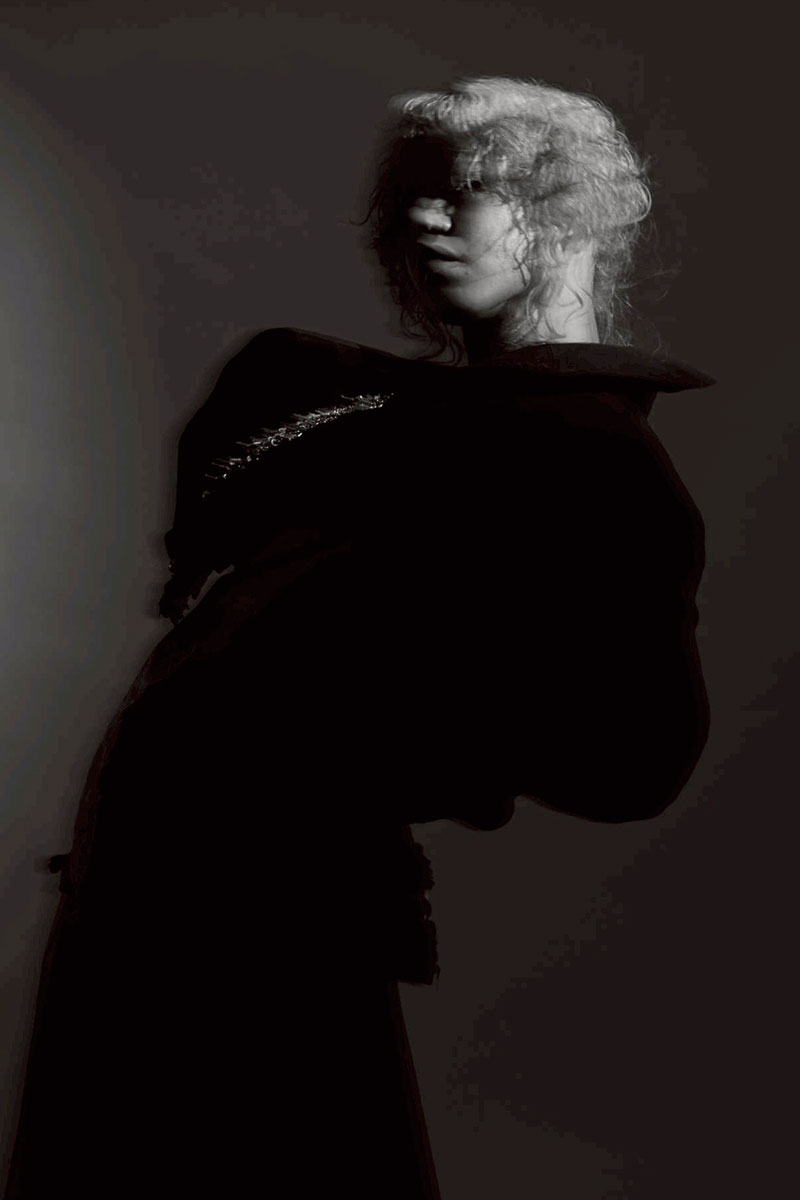 「影のなかに、部分的に髪を浮かび上がらせ、髪の存在感を削ぎ落としながら、ブレを効果的に用い、“余韻”を残すような演出にしています。モノクロ表現のなかには、光に触れる部分と影に沈む部分の両方がありますが、ヘア、衣装、背景のすべてにおいて陰影のバランスをうまく生かすことができたと思っています。しかし、ブレのある絵づくりは誰もが憧れるところ。ブレた写真を撮りたくて、わざとブレを狙って撮ったのですが、ブレていないクリアな写真もいい感じに撮れており、実はどちらを選ぶかとても悩みました(笑)」
