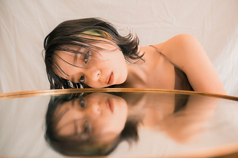 「モデルさんは鏡をのぞいているんですが、写真を見ている人は、鏡のなかのモデルさんと目が合うように絵づくりを。実際の彼女は自信なげな表情なんですが、鏡に映る彼女は強さを感じさせる……そんな女性の心を鏡を使って対比的に見せています。鏡に水を張り、撮影していたのですが、水面に映る彼女がクリアに見えすぎていたので、オーナーがブロアで波立たせようと提案してくれたおかげで幻想的なイメージをつくりだせました。でも、撮影中、ブロアの調整が難しく、ずいぶんとモデルさんに水がかかって大変だったんですよ(笑)」