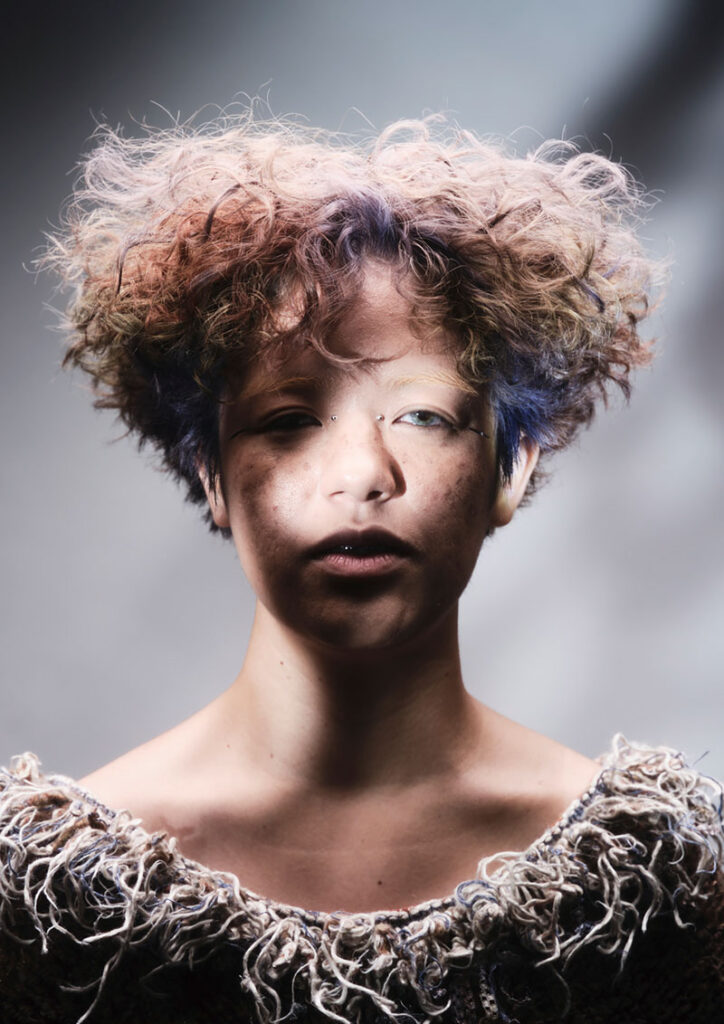「こちらは、反省点はあるものの、自分がつくりたいものがつくれたと感じられる作品。角を残したマッシュベースに、ふわっと広がる部分や束感、ねじれを強調するためにロットの太さをランダムに配置してツイストパーマを。真っ直ぐ芯のある人物像をイメージし、正面からのアングルで唯一無二の存在感を表現しました。ヘアカラーは、茶色をベースに深緑やだいだい色、藍色を使い、できる限り明度を統一し、シルエットや質感を構成しています。沖縄で生まれ育ち、培った感性を大切に、これからも作品をつくっていきたいと思っています」