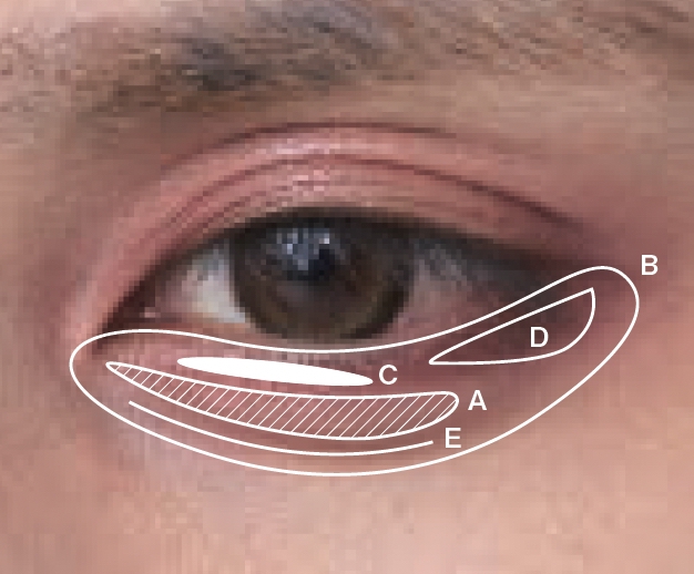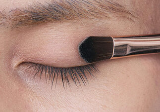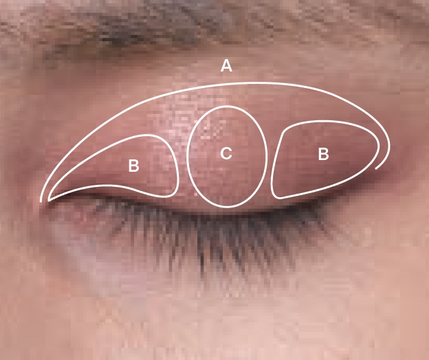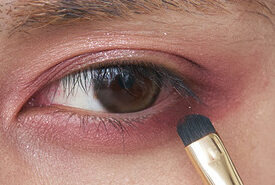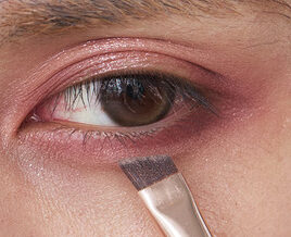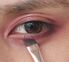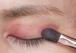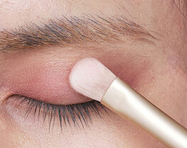 ゴールドブラウンのアイシャドウ(E)を引く。ラインはぼかす。