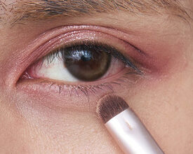 丸顔や童顔すぎると女性っぽくなるので注意が必要。対処法としては、例えばチークを入れず、つり目にしたり、目尻を長めに引いて強調するのがオススメ。中顔面を短縮すると幼く見えるので、面長に見せたり、男らしい雰囲気を作りつつ、目元を強調するとうまくいく。