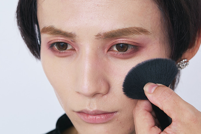エモーショナルな雰囲気を出すために必要なのが、儚さ。男らしさよりも幼さを出していきたいので、チーク+ハイライトや、リップでぷっくりとしたツヤ感を作る。