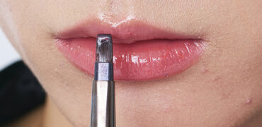 ファンデーションで血色を消してから、リップを2色(AとB)混ぜて全体に塗る。次に上下の中央にクリアグロスを塗る。上唇は山の上にも塗ってぷっくりした印象に。