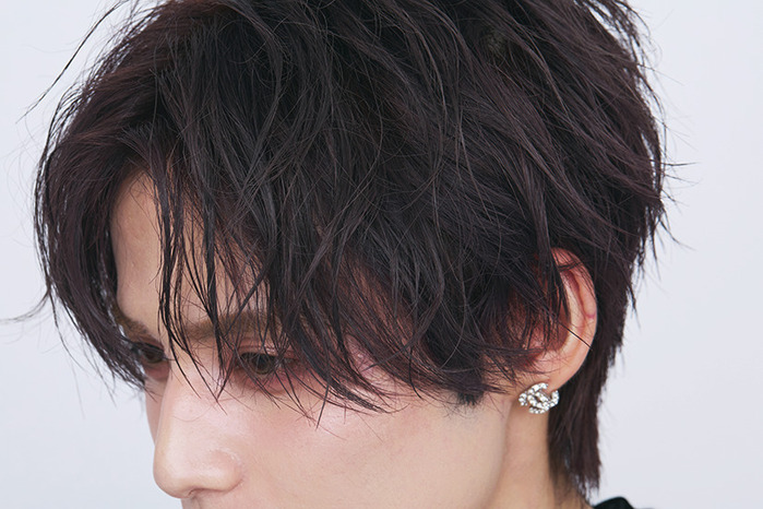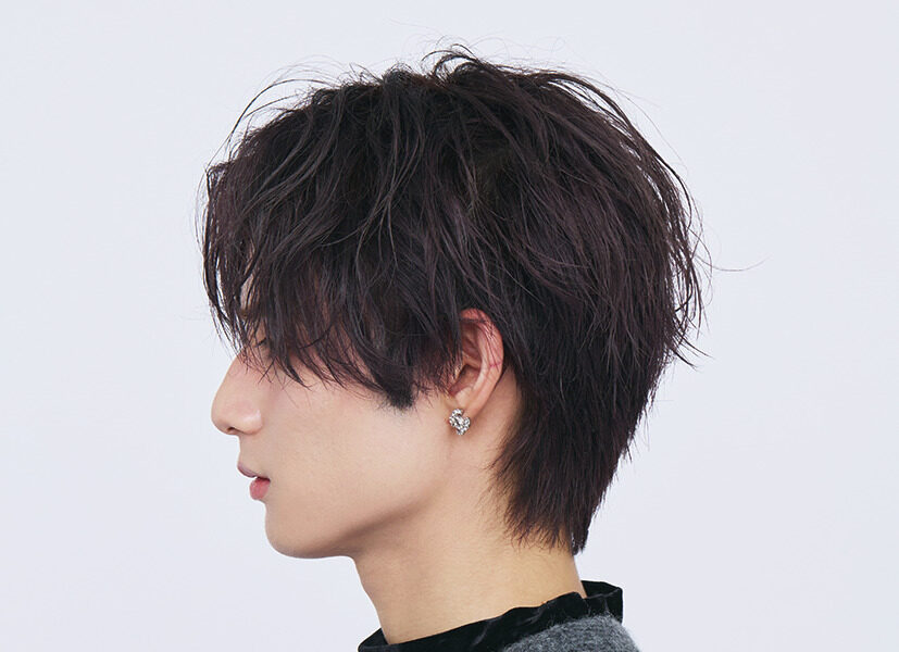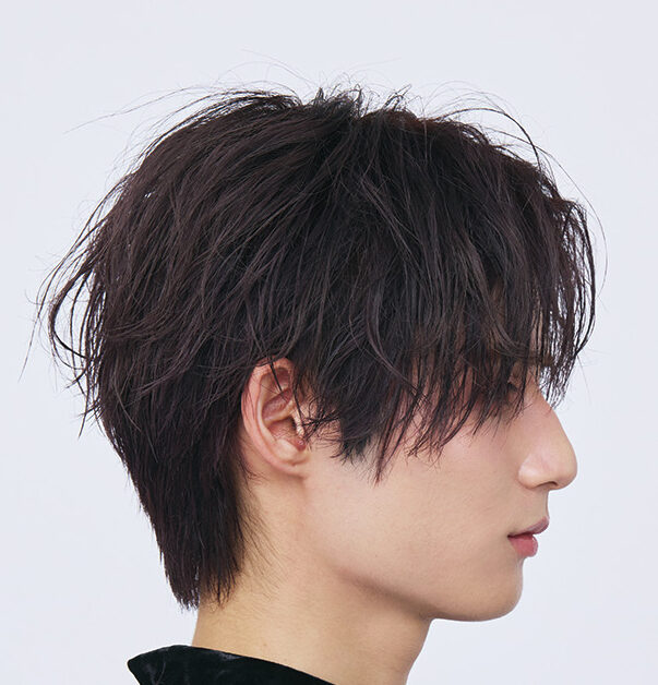 前髪はサイドと同じ長さに設定し、前髪を少し軽めにして、サイドに溜める。軽めにした前髪は毛束を散らすことで透け感を作るとエモさが出る。