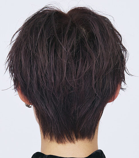 CUT/ショートレイヤーベース。トップは長めに設定し、低めにレイヤーを入れる。前髪とサイドの長さは平行にする。えり足は短めに設定。前髪は若干軽めにして、サイドに溜まるようにする。