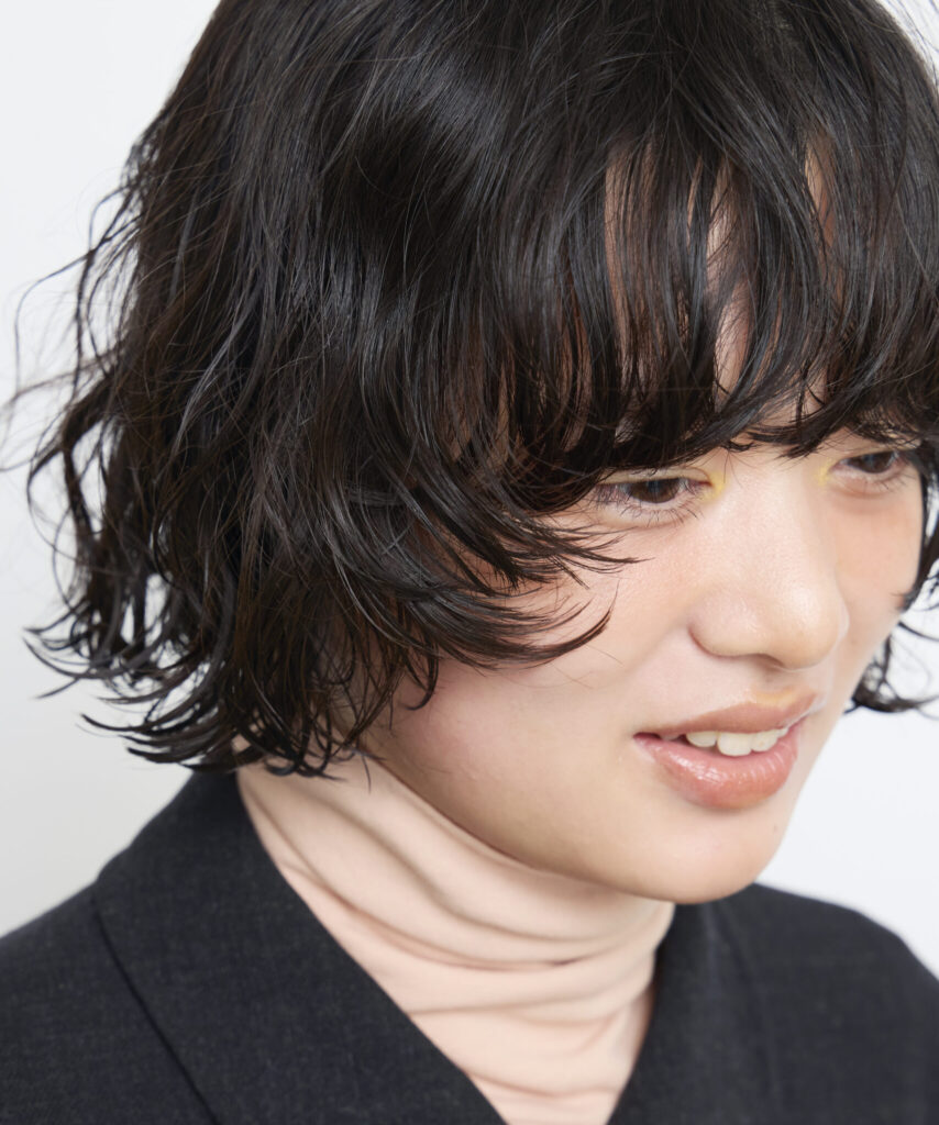 ニットが似合うショートヘアカタログ 03「ニットに映えるツヤ感。計算されたラフさに技アリのセンターパート。」